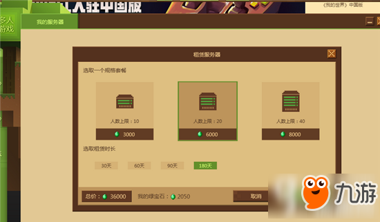 其中租用小型服务器(10人)30天需要3000绿宝石,租用180天的线的绿宝石。
