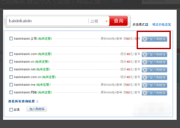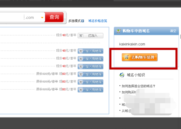 5、还有一点需要注意,不同的域名因为提供服务的服务商不同,域名价格是不同的。从图可以看出来,第一年域名价格从49元到220元之间不等。