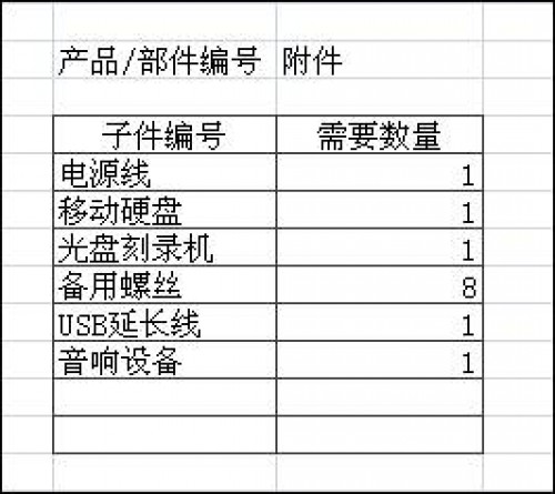 到此,我们虽然已将建立好了3级BOM,但还没有完成一台计算机所需的所有部件,在第一级BOM中,还有一个“附件”的部分,又都包括什么呢?所以我们继续建立关于“附件”的新表。这样一台计算机所有的组件就已经全部完成了在BOM表中的建立,在勤哲Excel服务器中,这个过程属于BOM维护这个模块。