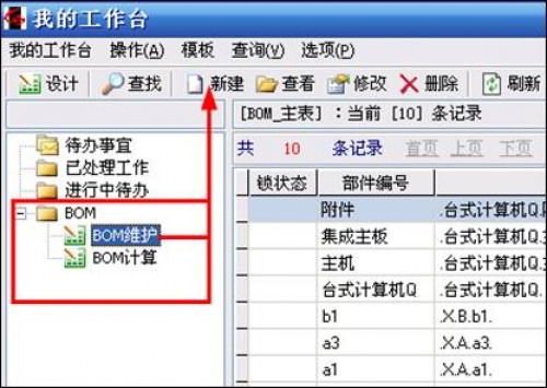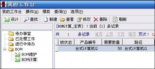 现在,我们来看一下,最后建立完成的BOM表在勤哲Excel服务器中的样子,从路径中我们已经可以看到基本的BOM数据目录了。下面我们要通过BOM计算来验证这个BOM维护中数据的正确性与否。