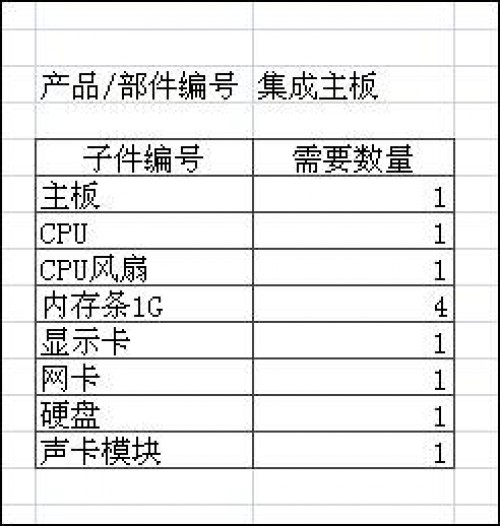 5、现在我们继续建立第三层BOM表,就是主板上又必须包含什么内容才能保证一台计算机正常运行呢?我们的初始名称为“集成主板”,那么我们在新表中按上述步骤继续建立第三层BOM数据表。组件不再一一列举,见下表即可。