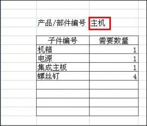 4、下面我们来考虑第二层BOM,在主机中又有哪些主要部件组成?我们在新的Excel表中填写出主机包含哪些组件,在产品/部件编号中填写:主机。我们在此约定,主机包含了:1、机箱1个、2、电源1个、3、集成主板1块、4、4枚螺丝钉。