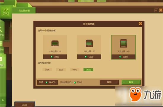 租用大型服务器(40人)30天需要8000绿宝石,租用180天则需要48000绿宝石。