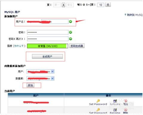 2、创建数据库用户,填写用户名、密码,点击“生成用户”即可。然后在“向数据库添加用户”给用户分配权限。