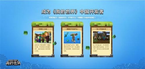 为了帮助开发者便捷地完成内容发布、管理和更新,《我的世界》开发者平台正在紧锣密鼓地准备中。凭借这一平台,所有通过审核的作品可以快速向玩家呈现。除此之外,《我的世界》将建立中国版开发者社区,可以与全世界最顶尖的内容创作者分享对创意的见解,学习和讨论开发经验。