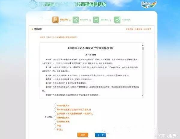请阅读《深圳市小汽车增量调控管理实施细则》,然后【选择】相应身份类型,确认无误后,点击【下一步】,进入申报信息填写界面。