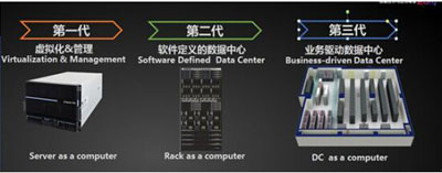 a) 通讯延迟降低77%:传统架构最低通信延迟超过10微秒,而InCloudRack通信延迟为2.3微秒。 b) 灵活多样,按需扩展:传统树形网络所有的通信(纵向/横向)都需要经过机柜交换机,无法按照业务负载进行调配,也不易扩展。InCloudRack采用了分布式UNE阵列,支持多种组网方式,并且可以根据负载和应用类型进行纵向/横向流量动态调配,网络规模可以随需扩展。 两者都是浪潮融合架构方案,针对的用户群体会不同,InCloudRack针对行业、企业用户,而SmartRack针对互联网运营商,由此产品的内部设计、成本截然不同: a) SmartRack重在部署性和经济性,特点是部署快、低能耗、易维护、密度高,目前在中国的市场占有率超过60%,应用于阿里巴巴、百度和12306等大型互联网数据中心。 b) InCloudRack在高可用、智能等高级特性方面更为突出,不仅电源、管理等辅助模块全部采用冗余和热插拔设计,而且还支持八路和四路节点的线性扩展,可以更好的满足私有云、关键行业的应用技术需求。 4 、 以IncloudRack为例,浪潮如何理解“融合架构=硬件重构+软件定义”? 融合架构以硬件重构和软件定义为核心,其具体的技术手段就是“解耦、集中、虚拟、智能调度”,就是在硬件层面将计算、存储等各类资源解耦合,分类集中,再通过虚拟化技术和资源调度技术,实现各类硬件资源池化,让基础架构可以感知业务负载,而自动调整,达到融合架构的最终目标SDDC。 软件定义和硬件重构缺一不可,只靠软件定义,没有硬件重构,软件定义效率不高,只有硬件重构,没有软件定义,基础架构的复杂性会大幅增加,甚至失控。 InCloudRack采用分布式网络,高带宽、低延迟、扁平化的网络架构,横向扩展能力很强,更容易被软件定义。是一款实现了“Rack as a computer”层次的融合架构的产品。