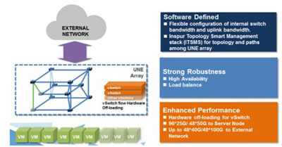 l 将原先在超大型数据中心核心网络层使用的分布式、多节点的网状互联架构首次引入到整机柜的设计中去,以提高节点间的横向通讯效率。 l InCloudRack将传统的网卡、交换机取消,统一设计为UNE网络引擎(Unified Network Engine),每个UNE链接4个计算节点,然后UNE之间组成分布式网络阵列,在逻辑上构建成一个机柜级的交换核心,实现与主干网络的连接。每个UNE对内有8个25G的PCI-E接口,对外有4个40G和4个100G的以太网接口。