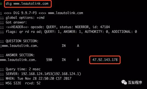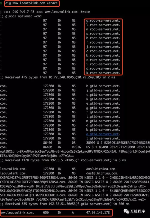 带上查询路径的dig的输出更加复杂。要注意的第一部分是在最开始部分列出的13台服务器。这些是互联网实质上的根服务器,我们是直接向它们查询的。然后,它查询了com域,可以看到解析出来的所有的域名服务器。在这些域名服务器上,它直接解析了进而解析到了 域的NF1到NS2域名服务器。我们称这些NS服务器为名称服务器( Nameserver)。它们为域名 leautolink.com提供了DNS功能。这说明实际上有2台服务器在一起为leautolink.com.提供DNS名称解析,最终解析到了我们实际的服务器IP地址。(请反复阅读这段文字,深刻理解以下)