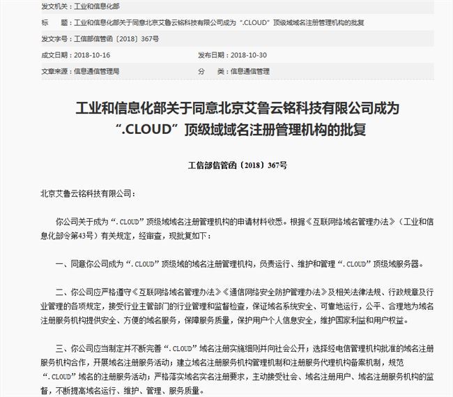 以下为《工业和信息化部关于同意北京艾鲁云铭科技有限公司成为“.CLOUD”顶级域域名注册管理机构的批复》全文: