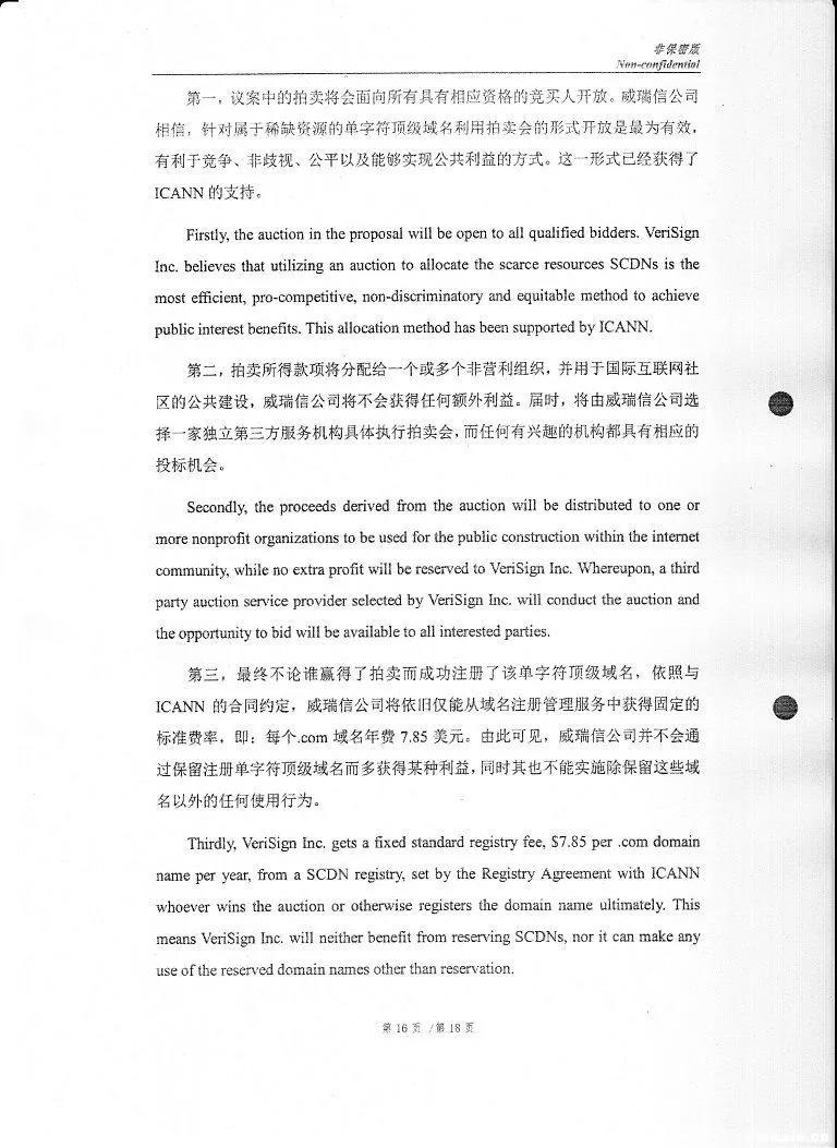 第一,议案中的拍卖将会面向所有具有相应资格的竞买人开放。威瑞信公司相信,针对属于稀缺资源的单字符顶级域名利用拍卖会的形式开放是最为有效,有利于竞争、非歧视、公平以及能够实现公共利益的方式。这一形式已经获得了ICANN的支持。