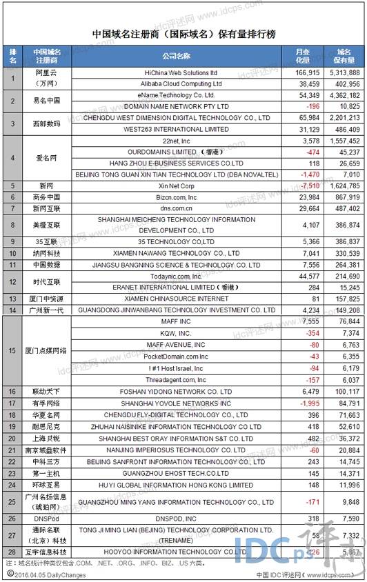 通过图1获知,截至2016年4月5日,国内注册保有量排在前15位的域名商分别是:阿里云(万网)、易名中国、西部数码、爱名网、新网、商务中国、新网互联、美橙互联、35互联、纳网科技、中国数据、厦门中资源、广州新一代、厦门点媒网络。
