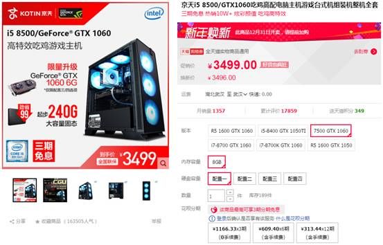 这款主机目前活动限时全选项升级Intel酷睿i58500处理器,六核心六线程,性能已经可以和上一代的i77700有的一比了,所以它也是众多Intel处理器中性价比相对较高的一个选择。8GDDR4的内存大小也目前的标配,频率从原来的2400提升至2666,升级240G固态硬盘;额定400W的老牌金河田电源,能够保证主机持续稳定的供电。吃鸡最关键的显卡为七彩虹GTX1060-3GD5,GTX1060能够保证在全高特效的情况下,主机能够流畅的运行游戏并拥有更好的游戏细节展示。