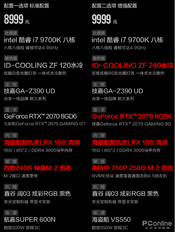 这款主机还搭载了七彩虹GeForce® RTX 2070 GAMING GT显卡,是保证主机性能的另一重要因素,它的存在可以让主机运行各种大型的3D网络游戏,以及大部分非常吃显卡的单机游戏。该主机采用ID-COOLING 120一体式水冷,让高负荷运行时CPU依然凉爽,技嘉GA-Z390-UD主板以及航嘉SUPER 600N电源确保整机运行的稳定性,海盗船复仇者16G(8G*2) 3000内存,性能和颜值都是一大提升,西数240G绿盘 M.2 SSD,搭配起来基本已是目前的旗舰级配置了。