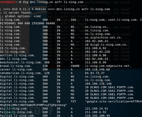 @ 指定域名服务器; axfr 为域传送指令; xxx.edu.cn 表示要查询的域名;