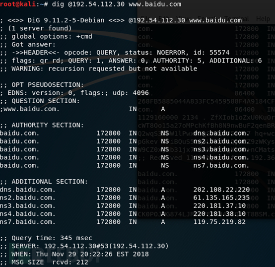 【此处可以用dig @192.54.112.30 查看返回的百度顶级域名服务器IP地址】。