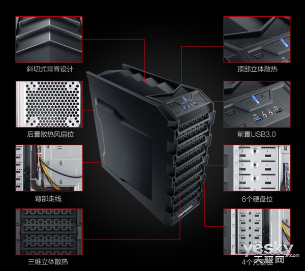 外观方面,极限矩阵猎豹V9C采用了星战中的黑武士设计元素,纯黑的颜色,搭配耐磨金属机身,酷炫十足。整机前部全面散热孔设计,让主机热量及时排出,冷静战斗。整机散热优良,走线简洁,接口配备一应俱全,预装Win 10系统,方便玩家开机即用。